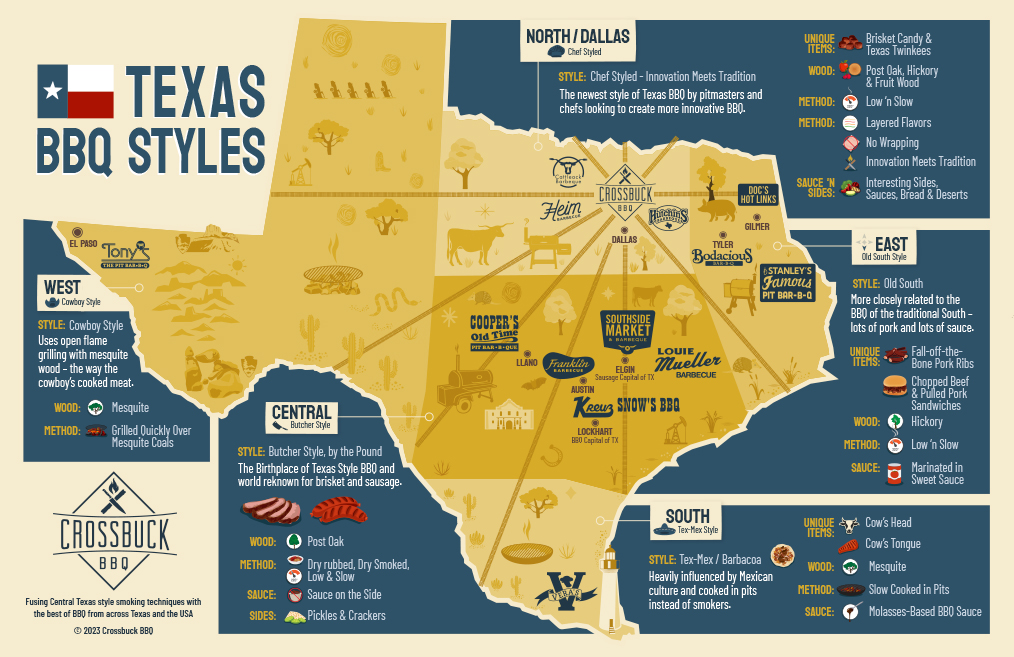 While there may be no single style of Texas BBQ, most Texans agree that there are four main regional styles. These styles are often closely aligned with the type of woods available in each area and the heritage of many of its people.
